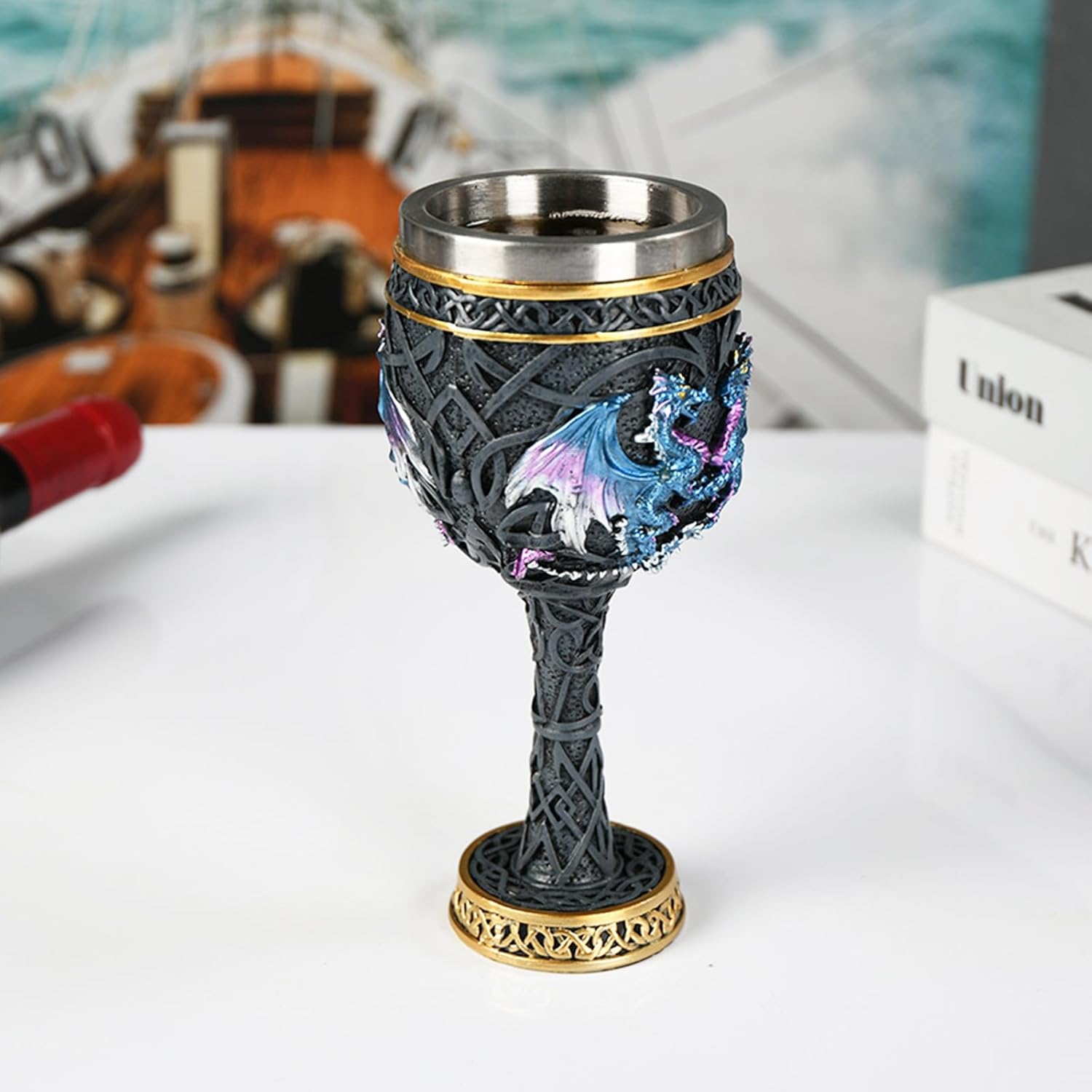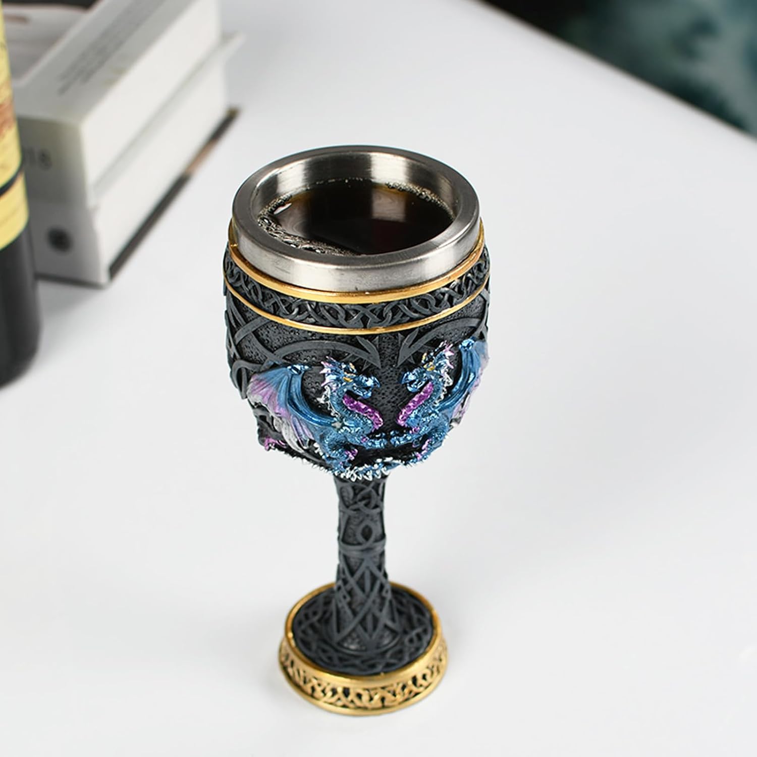 Bronze Dragon Goblet with Stainless Steel Cup, Dragon Wine Medieval Dungeons and Dragons Chalice, Dragon Gift Collectible - 7oz (Blue Dragon Cup)