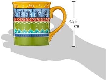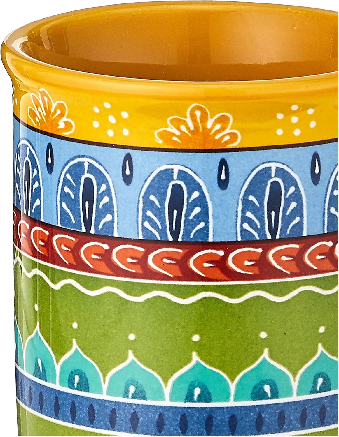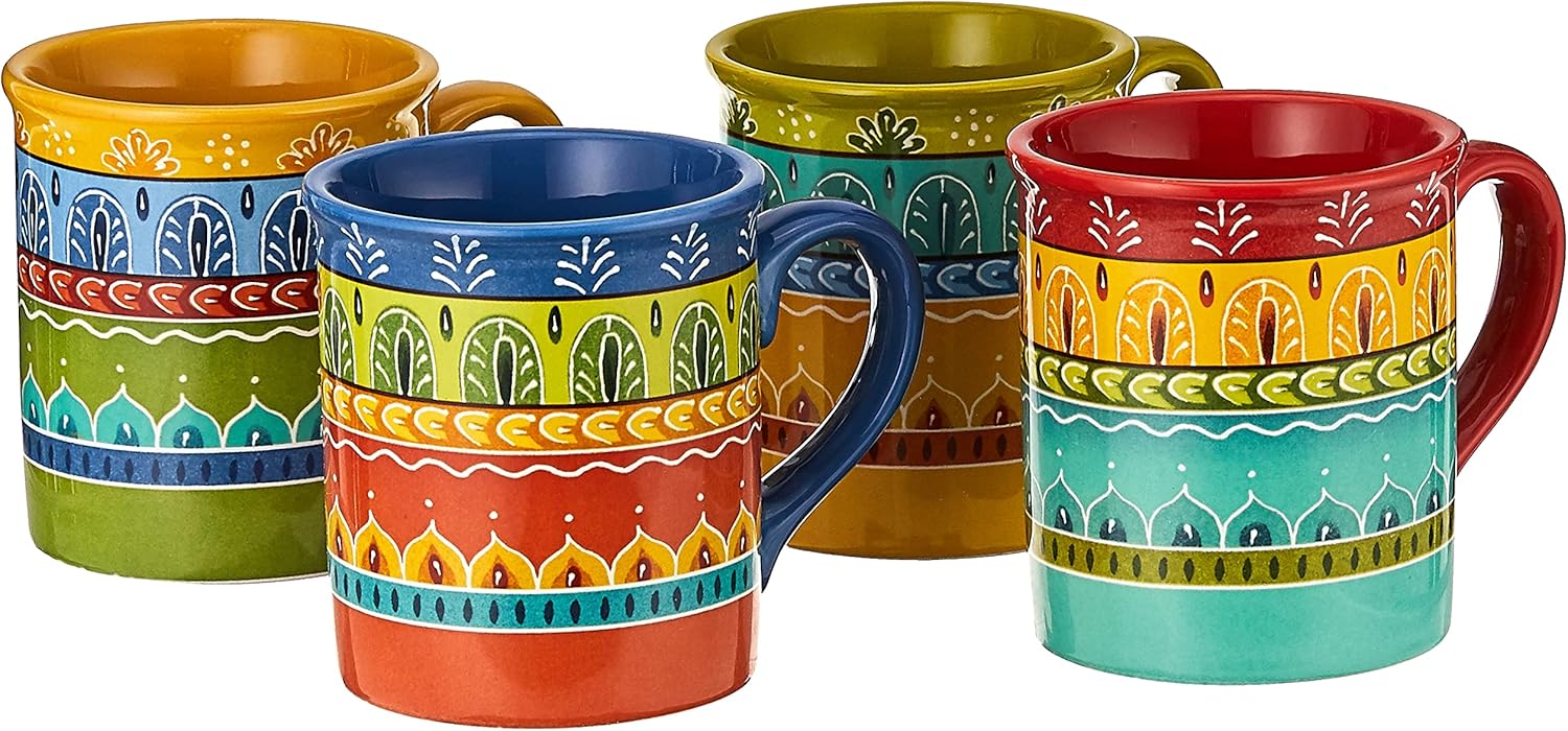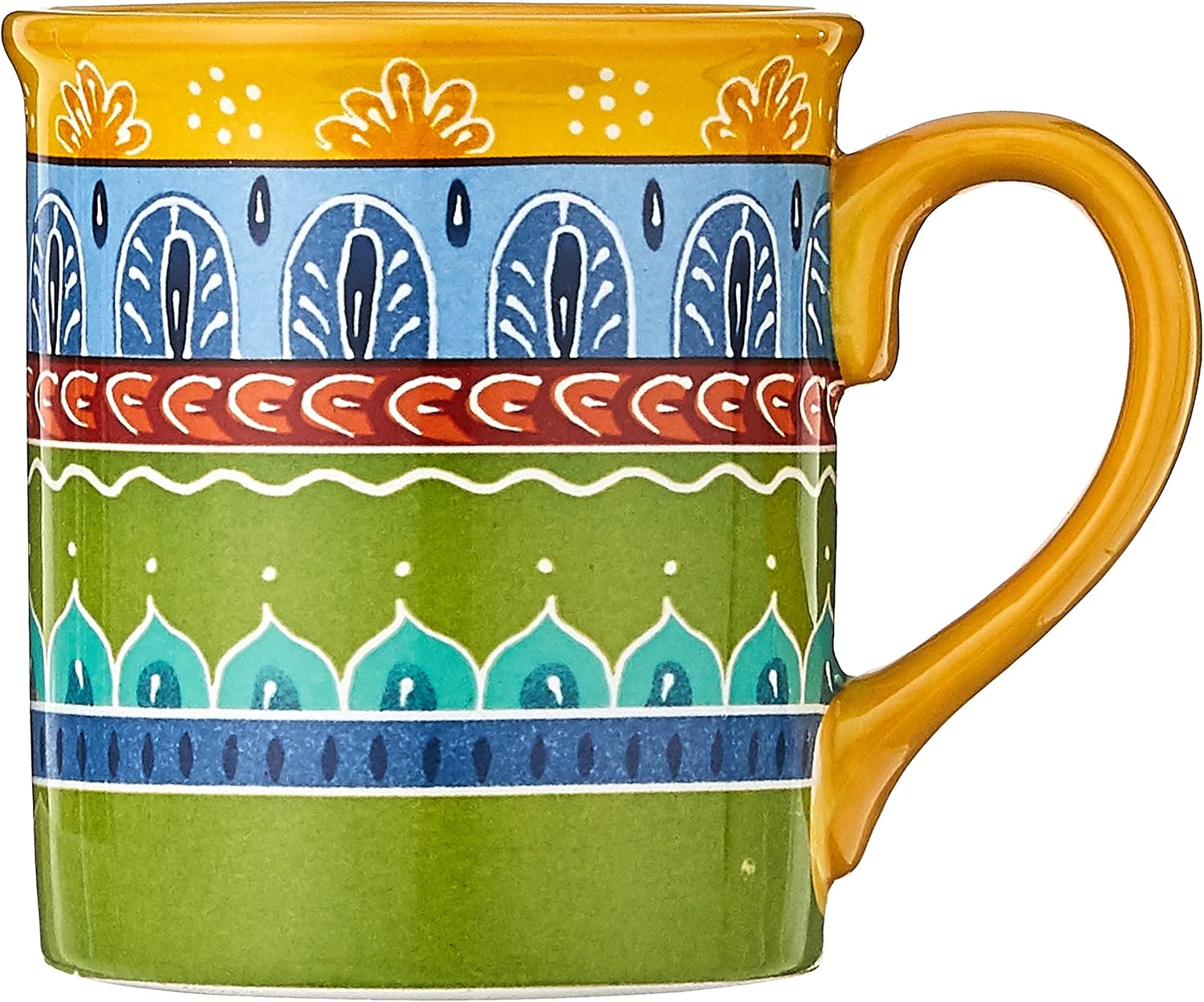 Add personality and pop to your kitchen with the Certified International Valencia 16 oz Ceramic Mugs. This set of four features bright, boho-style patterns in a cheerful mix of colors including red, yellow, blue, green, and orange. Designed to energize your morning routine or enhance your afternoon tea, each mug offers a generous 16-ounce capacity, perfect for coffee, cocoa, tea, or hot cider. Made from durable ceramic with a glossy glazed finish, these mugs are microwave safe and dishwasher safe, offering convenience for daily use. The comfortable handles and sturdy build make them practical, while the vibrant designs bring life to your drinkware collection. Whether you're hosting a casual brunch, enjoying a quiet moment, or looking for a colorful gift idea, the Valencia mugs make every sip feel festive. Use them indoors or outdoors, on your kitchen shelf or patio table, and pair them with the matching Valencia dinnerware to create a complete, eclectic table setting.