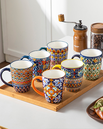 Elevate your kitchen with these premium ceramic mugs, featuring vibrant Bohemian patterns. This set of four combines durability with artistic charm, perfect for enjoying coffee, tea, or simply adding a stylish touch to your space
